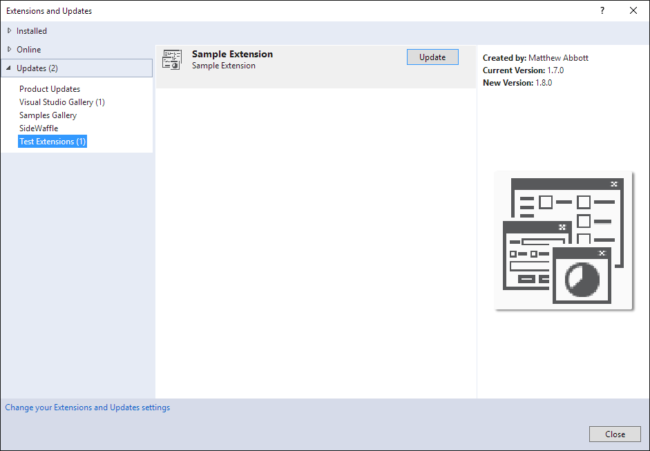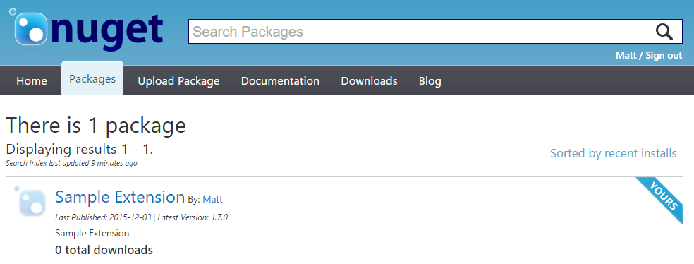 Because extensions are provided through the same NuGet core as normally packages, you can use nuget.exe the same way as part of your workflow, either manually, or through CI/CD. This allows a great deal of automation when you are authoring updates to your internal extensions. Alternatively, because this is based on NuGet Gallery, you can simply upload a new version of your extension, e.g, I currently have this listed in my personal extensions gallery: